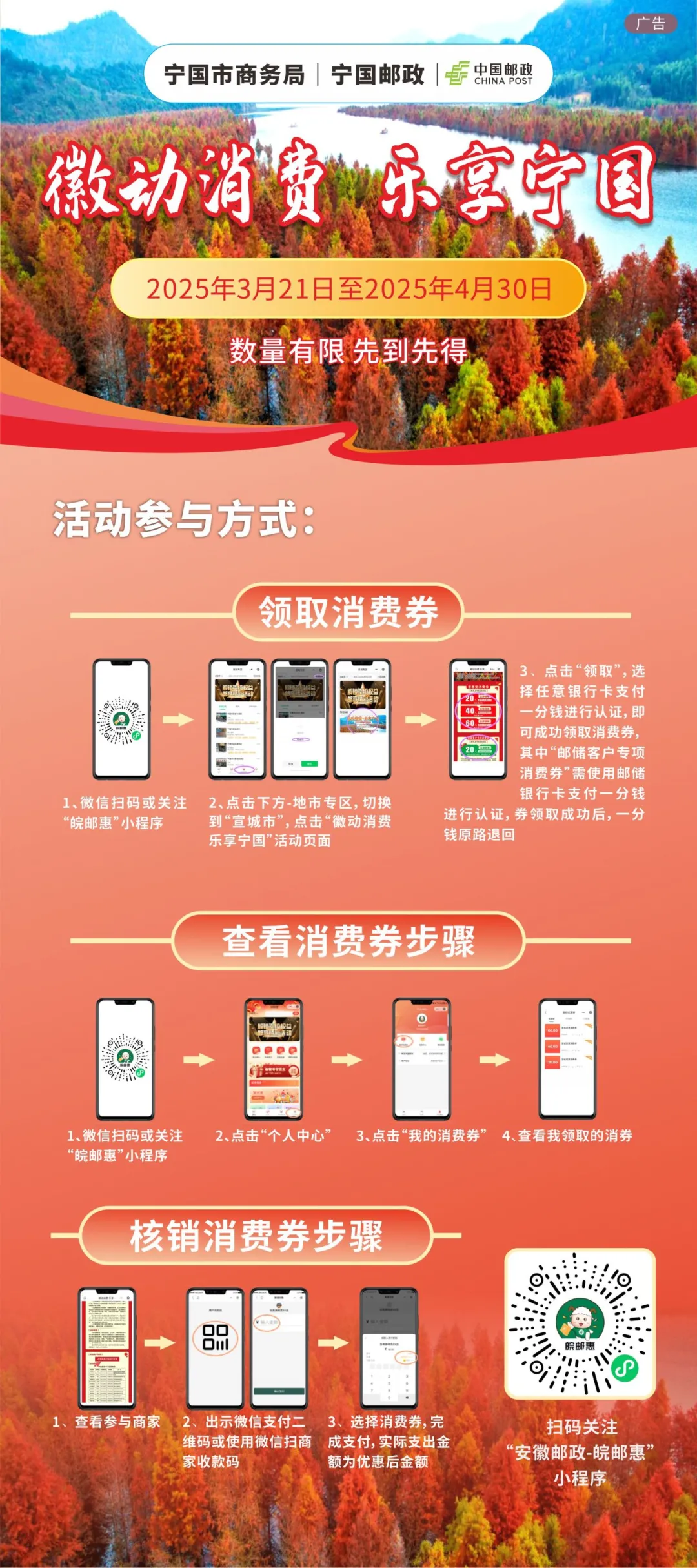 文章來(lái)源:四九八網(wǎng)絡(luò)發(fā)布時(shí)間:2025-03-28 14:00:07熱度:5562025年3月21日至4月30日,安徽省寧國(guó)市商務(wù)局?jǐn)y手安徽郵政正式啟動(dòng)2025年“徽動(dòng)消費(fèi)·樂(lè)享寧國(guó)”促消費(fèi)活動(dòng),本次活動(dòng)總預(yù)算達(dá)到300萬(wàn)元,旨在推動(dòng)本地消費(fèi),促進(jìn)經(jīng)濟(jì)復(fù)蘇。
