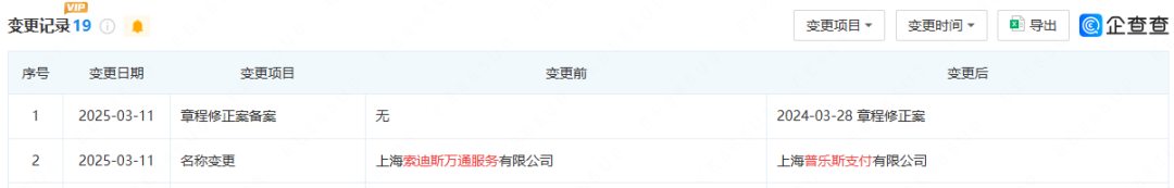 文章來源:四九八網絡發(fā)布時間:2025-03-19 14:14:48熱度:452近日,企查查顯示,上海索迪斯萬通服務有限公司的企業(yè)名稱已變更為“上海普樂斯支付有限公司”。