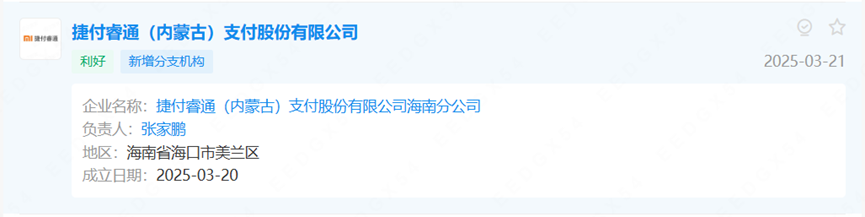 文章來源:四九八網(wǎng)絡(luò)發(fā)布時間:2025-03-27 09:07:02熱度:416近日,捷付睿通(內(nèi)蒙古)支付股份有限公司(簡稱“捷付睿通”)近日再新增一家分支機構(gòu)——捷付睿通海南分公司。該分支機構(gòu)成立于2025年3月20日,負責人為張家鵬。