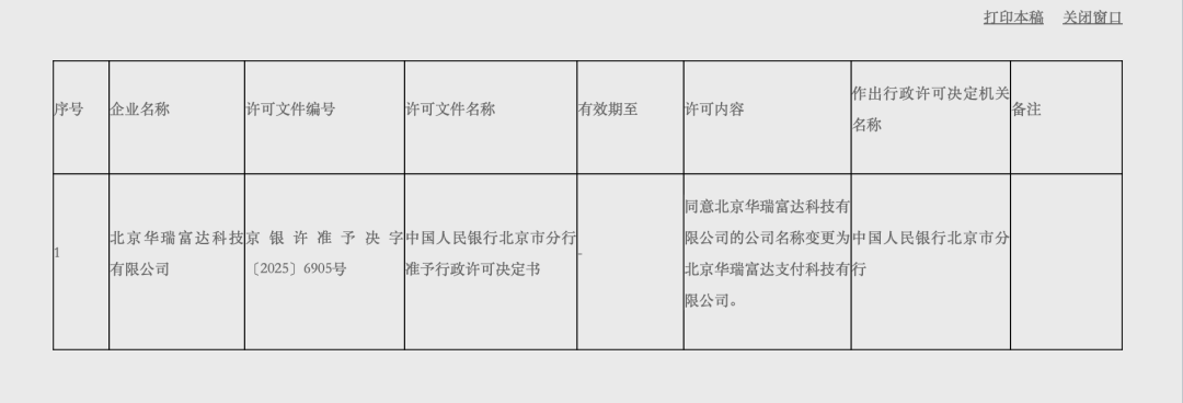 北京華瑞富達(dá)支付成立于2007年,于2012年獲得由中國人民銀行頒發(fā)的《支付業(yè)務(wù)許可證》,并于2022年6月續(xù)展成功,業(yè)務(wù)類型儲(chǔ)值賬戶運(yùn)營Ⅱ類(預(yù)付卡發(fā)行與受理),業(yè)務(wù)范圍北京市。