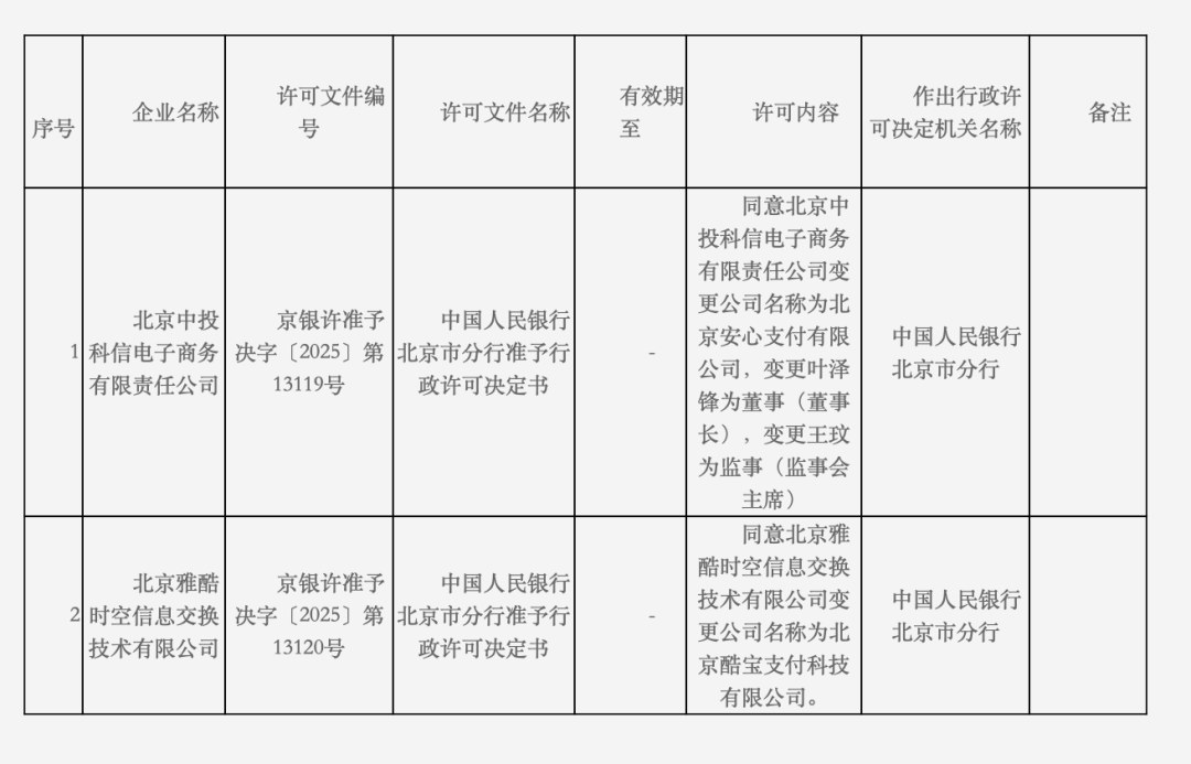 中國(guó)人民銀行北京分行同意兩家支付公司改名